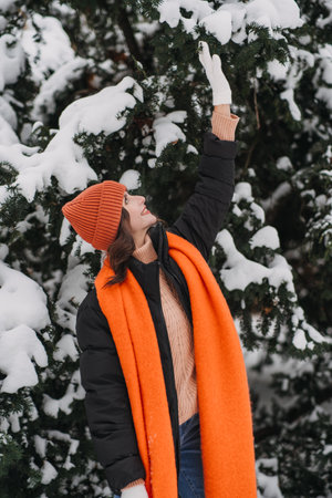 Woman in orange beanie and scarf touching snow-covered tree branches. Winter nature connection, seasonal outdoor mindfulness, nature therapy trends