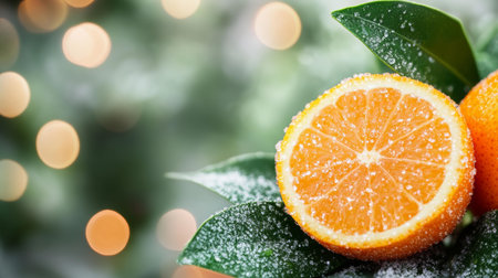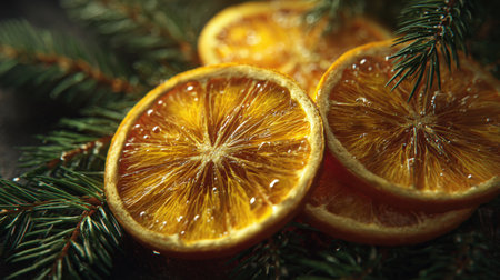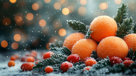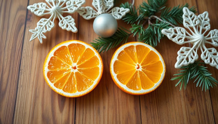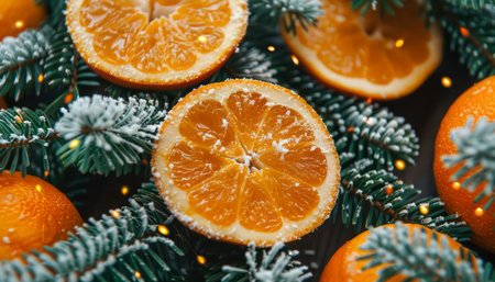 Capture the spirit of Christmas with this vibrant image Fresh orange slices, frosted spruce branches, and golden holiday lights create a warm and inviting ambiance perfect for seasonal celebrations and winter decorations The bright oranges and greens bring a touch of cheer to any space, while the golden lights add a touch of magic and sparkle This image is perfect for holiday cards, invitations, and decorations AI Generative