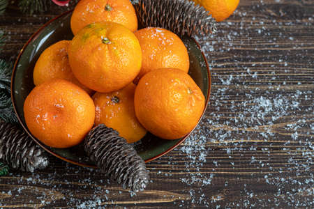 Tangerines on a wooden background with branches of a Christmas tree and pine cones covered with snow. New year concept. Copy space.