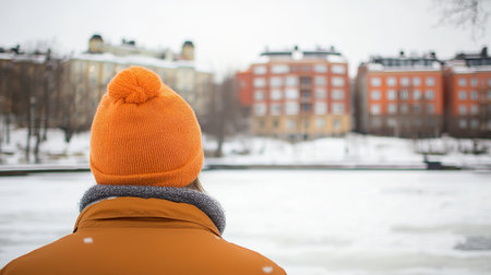 Person in orange hat overlooking snowy urban scene.