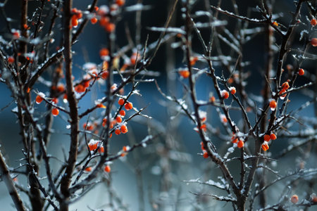 Icy branch of sea buckthorn with orange berries. Selective focus.
