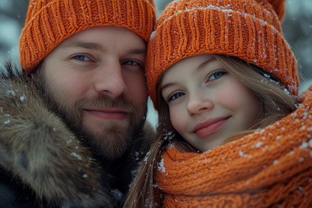 Heartwarming portrait of a father and daughter in matching winter attire amidst a snowy landscape