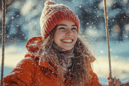 Joyful woman in red coat smiling on swing amid snowfall, creating a cozy winter atmosphere