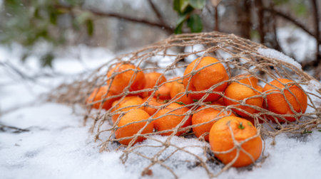 Oranges are neatly placed in a jute net blanketed by snow on the ground among trees. This winter scene highlights a unique contrast of fruit and icy surroundings.
