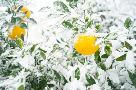 Tangerines on the tree branches covered with snow in winter morning, Athens, Greece, January 8th 2019. Horizontal.