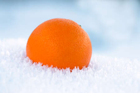 An orange, round, bright orange lies in the snow. Ice crystals. Close-up.