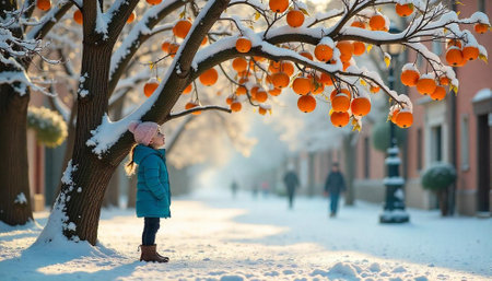 Winter Dream: Girl Gazing at Orange Fruits in Snow