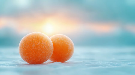 Two orange candies in the snow on a blue background. Copy space.