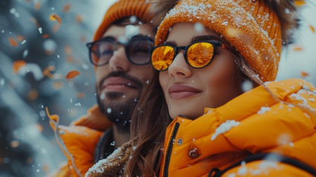 Autumn or fall season. fashionable woman man couple wearing orange clothing and eyewear stands amidst falling leaves and confetti, posing with a man for a beautiful outdoor portrait