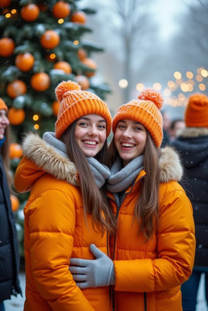 Portrait of two young women in orange coats and hats on Christmas market