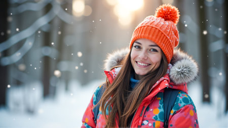 A woman stands in a snowy forest wearing a vibrant winter jacket and an orange beanie, smiling happily as soft snowflakes fall around her in the warm afternoon light.