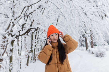 A beautiful Chinese woman in a winter park is talking on the phone, warmly dressed for a walk