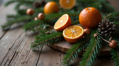 Christmas or New Year composition with fresh oranges and fir branches on wooden background