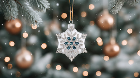Sparkling snowflake ornament silver bauble Christmas tree winter bokeh holiday decoration