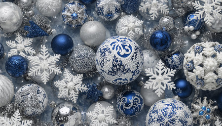 Blue and white ornaments and snowflakes rest on soft white fur, creating a serene winter atmosphere perfect for the holiday season.