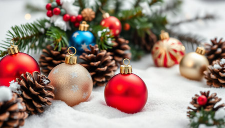 Festive Christmas ornaments, pine cones, and greenery in the snow create a vibrant holiday scene.