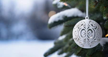 Beautiful white Christmas ornament in the tree. Blurred winter snowy background with copyspace. Nature aesthetic. Generative AI.