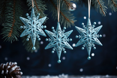 This image features elegant Christmas ornaments adorned with snowflakes, paired with fresh green pine branches, all set against a dark blue background, perfect for holiday themes.