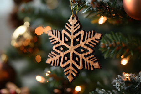 A close-up of a wooden snowflake ornament hanging on a lush christmas tree adorned with lights and decorations. warm glowing bulbs softly illuminate the branches, creating a cozy and festive holiday atmosphere. Generative AI
