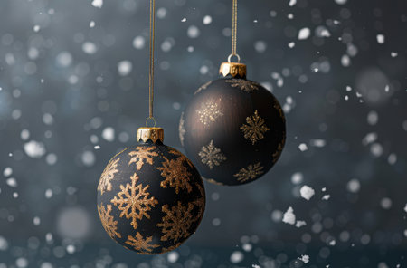Elegant black and gold christmas ornaments hanging in snowy winter scene