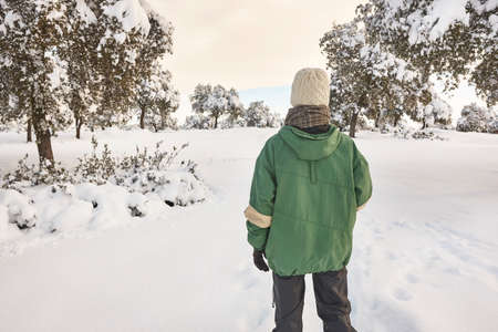 Young man in jacket in deep winter forest