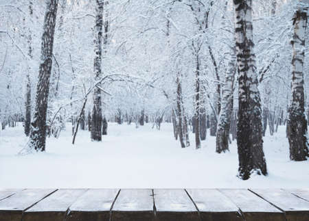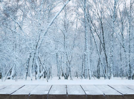Empty wooden deck table with winter background, trees in the snow
