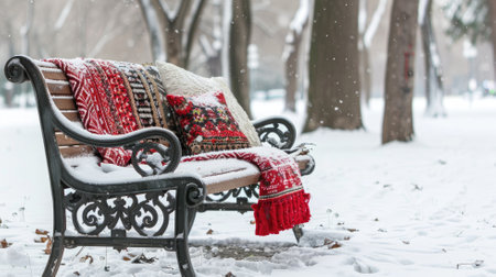 Park bench covered with blankets and cushions in snowy winter setting