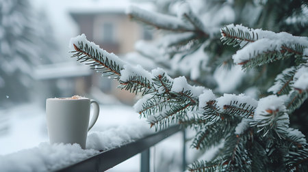 Cup of coffee on the background of a snowy winter landscape.