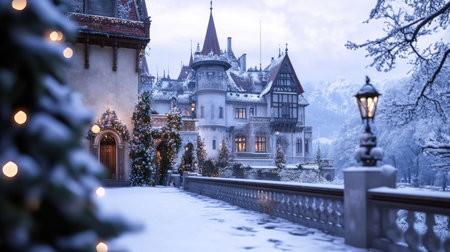 A picturesque winter scene featuring a historic castle blanketed in snow, adorned with festive decorations and twinkling lights, creating a serene holiday atmosphere.