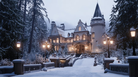 A magnificent castle enveloped in snow creates a serene winter scene. Warm lights illuminate the paths and trees, evoking a cozy and magical atmosphere.