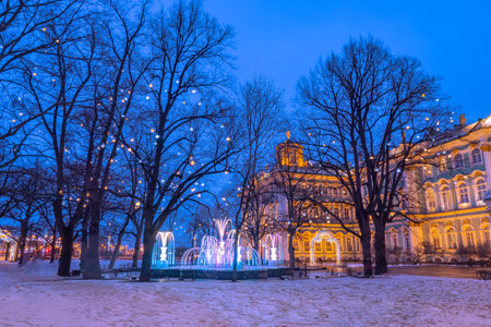 Christmas decoration of the city of St. Petersburg with electric garlands, the Garden of the Winter Palace and the Hermitage