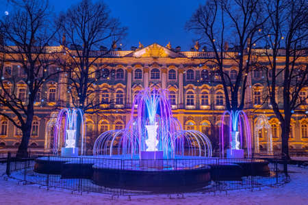 Saint-Petersburg in the New Year. Christmas in Russia. New Year decorations in the center of Petersburg. Street decorations made of garlands. Luminous arches and fountain of garlands near Hermitage.