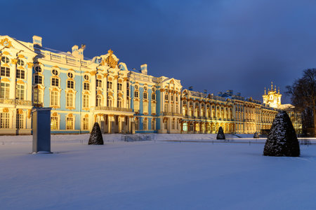 Catherine palace in Tsarskoe Selo at night in winter. Pushkin town. Saint Petersburg. Russia