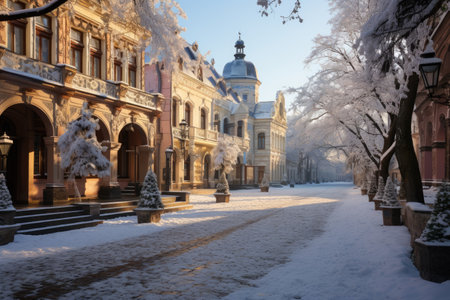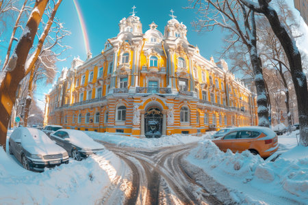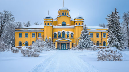 Majestic Yellow Manor House Covered in Snow on a Bright Winter Day, Architectural Photography