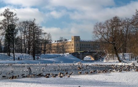 View of the Gatchina Palace from the White Lake. Winter. In the water of the pond there are many birds - ducks and seagulls. In the foreground is Karpin Bridge. Gatchina, Russia.
