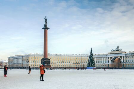 St. Petersburg, Russia-February 21, 2021: The square opposite the Winter Palace (Hermitage Museum), the Alexandria Column in winter in St. Petersburg. High quality photo