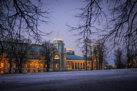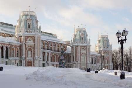 Tsaritsyno is a palace and park ensemble in the south of Moscow, founded by order of Empress Catherine II in 1776. An ancient palace in the winter cold. Snow drifts in front of the palace.