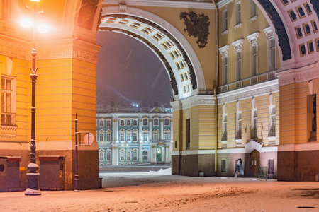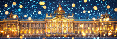 Illuminated Winter Palace With Golden Lights During a Snowy Night in Saint Petersburg, Russia