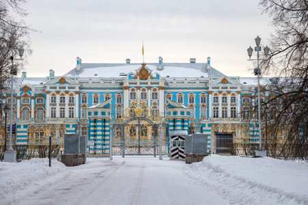PUSHKIN, RUSSIA - MARCH 08, 2022: Catherine Palace building on a winter day. Tsarskoye village