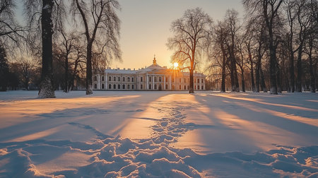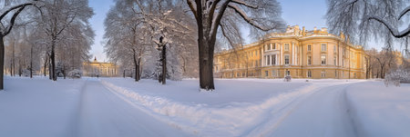Winter morning at the Palace in Saint Petersburg, Russia. Historic building with a snow-covered park