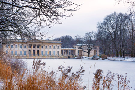 beautiful historic palace on the water in Åazienki Królewskie park in Warsaw, Poland during snowy winter