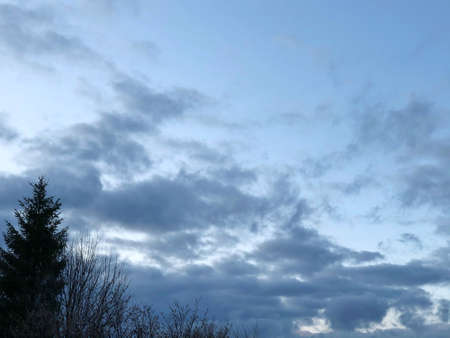 Nature dawn with pine in the sky and flying clouds. The landscape of the Northern nature. Panorama sky and air for background.