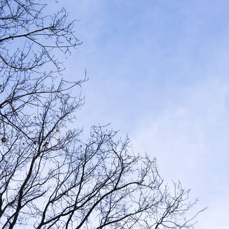 Early sunset in cold weather, winter blue sky with lifeless trees and dry branches