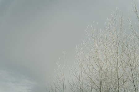 Tree with branches covered with fresh snow. Crown of birch against cloudy blue and white sky in winter. background with copy space. Christmas wallpaper on the theme of frosty winter day and cold season