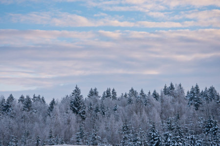 A snow-covered landscape of winter forest with tree tops covered with frost and caps of snow
