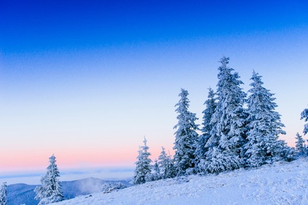 Trees in the snow. Snow-covered pine and spruce trees on the top of the mountain against the background of the winter sky.