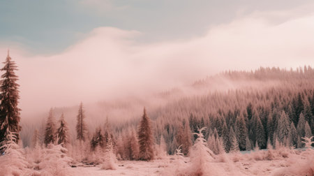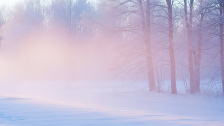 Frosty winter morning with a pastel sky, the soft pink and blue hues reflecting on the snow-covered trees, creating a peaceful winter background.
