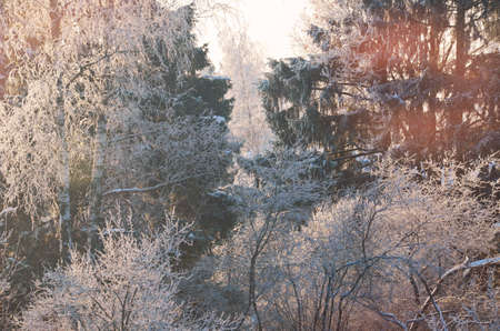 Frozen winter forest with snow covered trees. outdoor