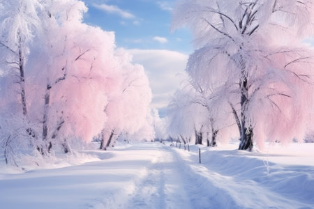 AI Generated. Beautiful morning winter landscape with snow-covered park, snowdrifts, cold pink skies and falling flakes of snow
