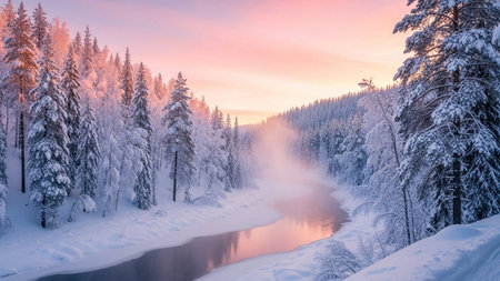 A river flows through a forest covered in snow, creating a serene winter landscape, A snow-covered landscape reflecting the pink light of dawn, AI Generated